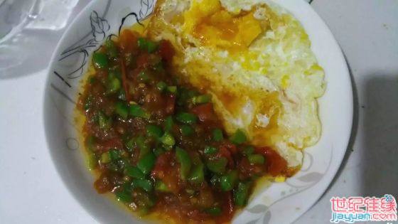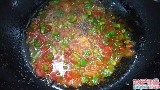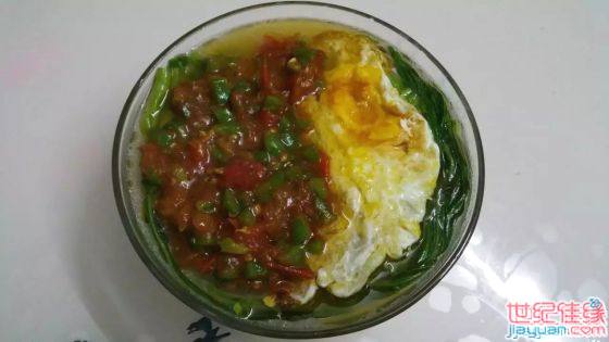 图1:锅烧热放油,煎蛋,放少量盐,蛋熟铲出;图2:锅烧热放油,油热后放入西红柿,加盖闷成汁;放入辣椒、生抽、耗油翻炒均匀; 图3:辣椒的熟程度可根据个人口味而定,盛出; 图4:面条快熟的时候放入洗净的菜; 图5:面条和菜熟后盛出,放上之前煎好的蛋和炒好的西红柿辣椒即可