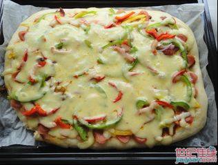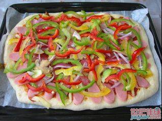 图四:铺上所有的材料,烤箱上下火160℃,将披萨放入烤箱中层,加热25分钟后取出