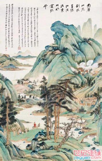 拍卖的此幅《江堤晚景》虽曰大千先生临本,但是整幅青绿设色,鲜丽润泽,皴法、水法、树法、人物、鞍马皆从董源化出而又自出机杼,雍容博大,雄浑壮阔。画中绿波粼粼青山高,酒帘静处马蹄轻,一片春风骀荡。让近千年积淀的文化瑰宝再次大放异彩!