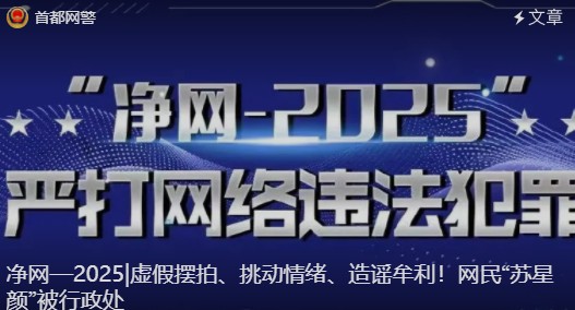 朝阳网警2025年8月25日【网警说案】《净网—2025|虚假摆拍、挑动情绪、造谣牟利!网民“苏星颜”被行政处》