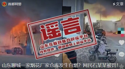 朝阳网警2026年1月27日【网警说案】山东聊城一家烟花厂家仓库发生自燃?网民石某某被罚!