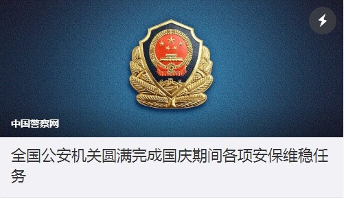 平安北京2019年10月10日【全国公安机关圆满完成国庆期间各项安保维稳任务】祖国的盛典、群众的欢歌,庆祝新中国70华诞,神州大地一片欢腾。记者8日从公安部获悉,国庆期间,全国公安机关认真学习贯彻习近平总书记重要指示精神,坚决贯彻落实公安部党委部署要求,以最高标准、最严要求、最周密措施,扎实抓好新中国成立70周年大庆安保维稳各项措施的贯彻落实,全国公安民警和警务辅助人员坚守岗位、忠诚履职,确保了国庆70周年系列庆祝活动安全顺利,圆满完成新中国成立70周年大庆和国庆期间各项安保维稳任务,广大人民群众在平安、祥和、欢乐的氛围中欢度国庆佳节。10月1日至7日,全国社会大局稳定、治安秩序良好,全国刑事警情同比下降8.7%,全国道路交通事故下降46%,各重点旅游城市和景区秩序井然,各地群众性欢庆活动有序开展,852场大型庆祝活动和132场焰火燃放活动安全顺利。 全国公安机关圆满完成国庆期间各项安保维稳任务