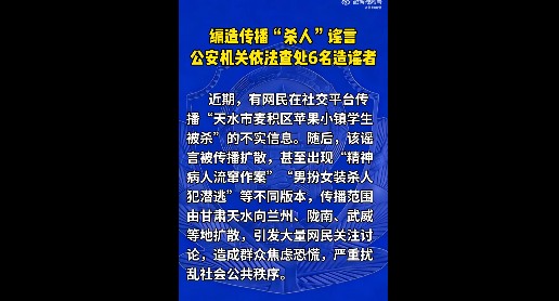 朝阳网警2025年12月26日【网警说案】编造传播“杀人”谣言,甘肃公安机关依法查处6名造谣者。