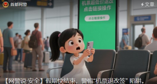 朝阳网警2025年10月9日【网警说安全】假期快结束,警惕“机票退改签” 陷阱。