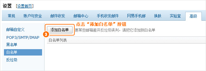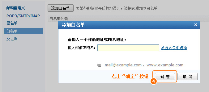 第四步:将"info@jiayuan.net"添加到白名单的输入框中,然后点击“确定”按钮