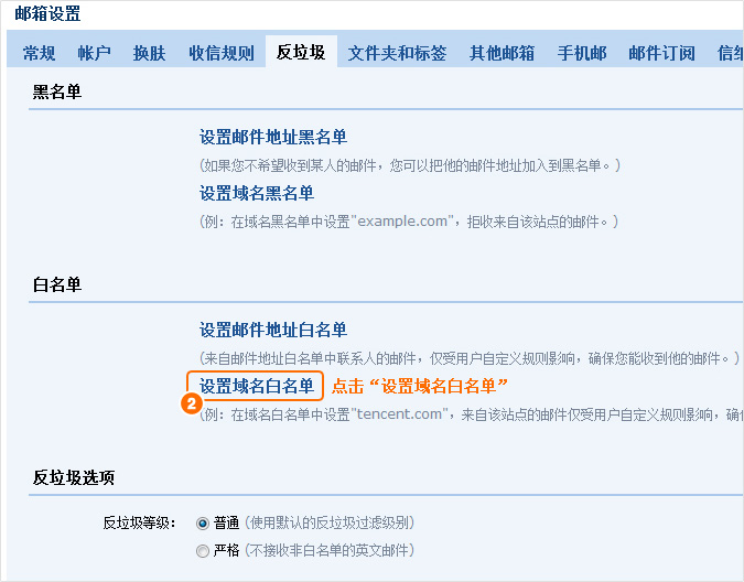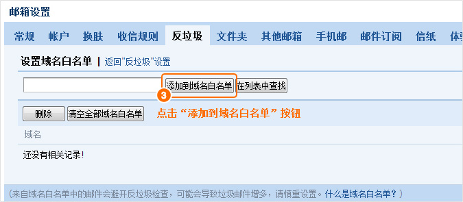 第二步:进入“邮件设置”中的“反垃圾”标签,在白名单中点击“设置域名白名单”
