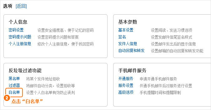 第二步:在“反垃圾过滤功能”的分类中选择“白名单”